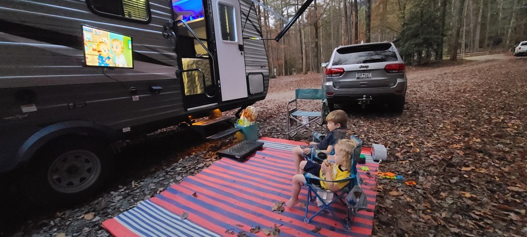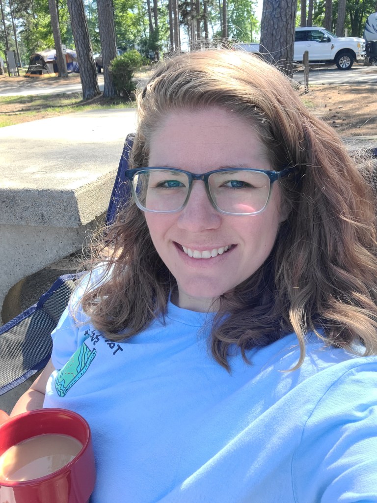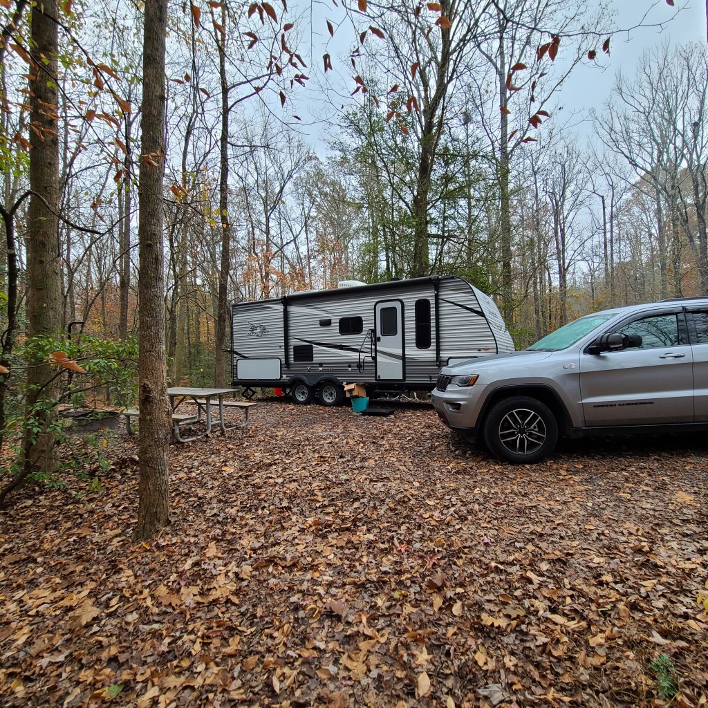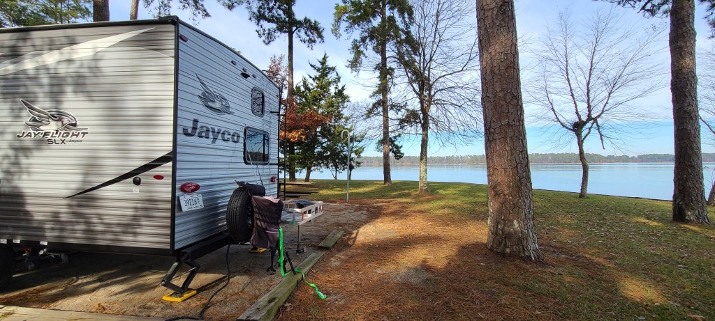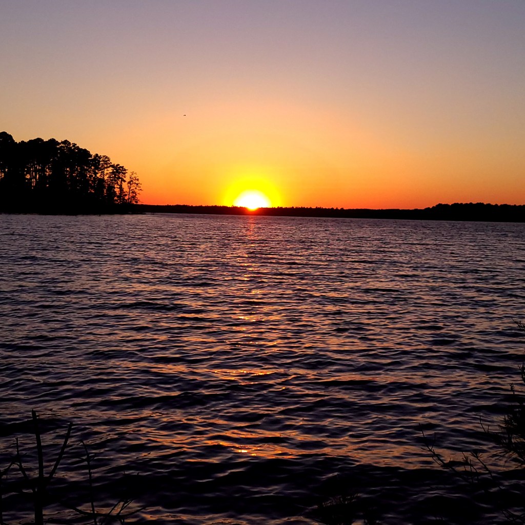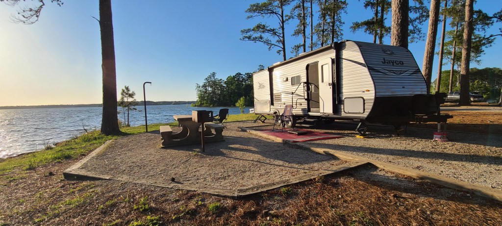 A few weeks later it was finally time for my trip. When the clock hit five, I tossed my heels in the back of the Jeep, strapped on my sandals, and headed off into the sunset. Eventually I’d like to be comfortable enough to haul the camper myself, but for this trip Steven graciously offered to haul and set-up for me. I arrived at site 41, and what a site! It’s one of seven sites on a point jutting out into Lake Strom Thurmond. There were other sites that offered more privacy, but I don’t know that there were any that offered better views or access to the lake.
