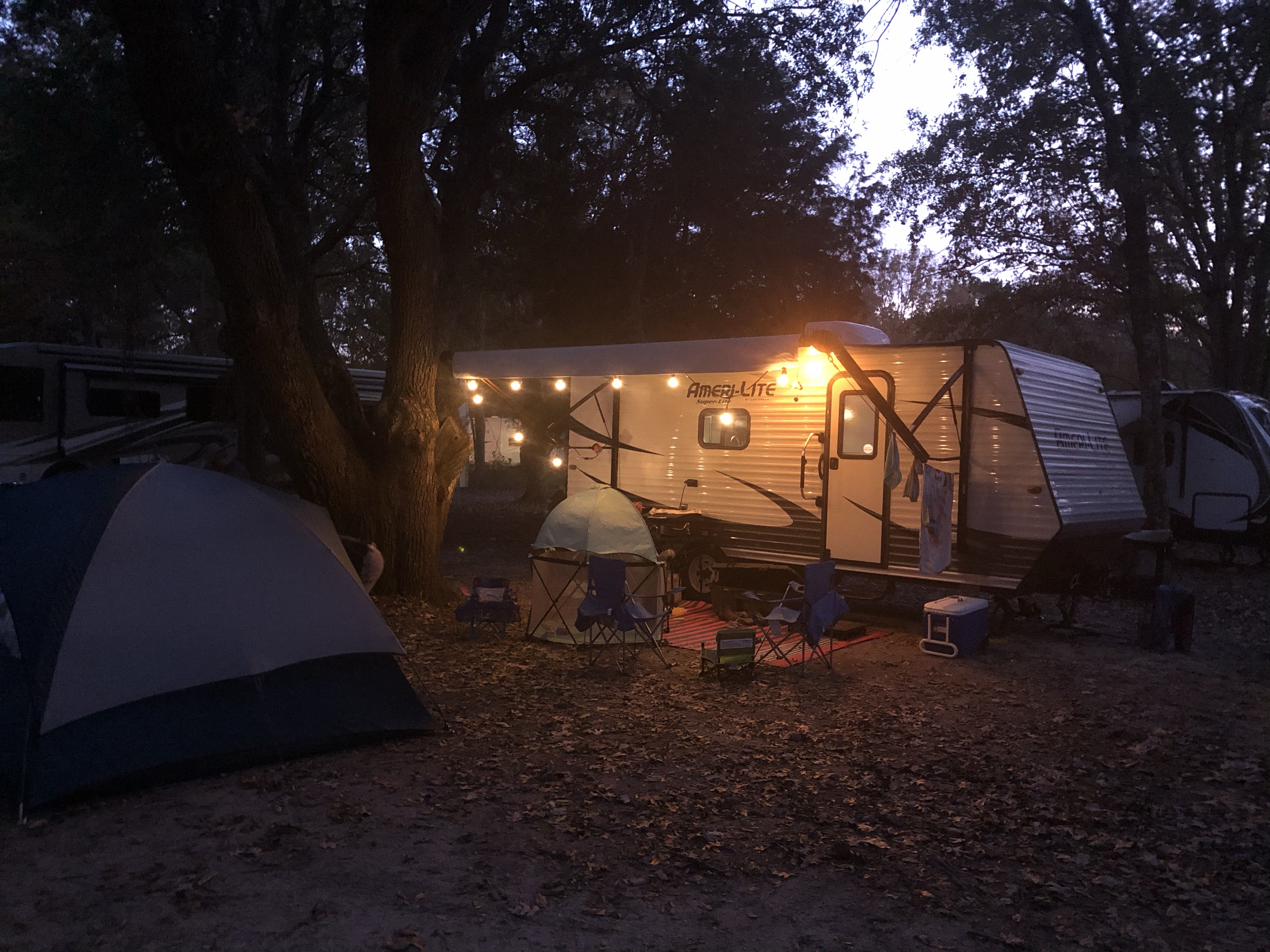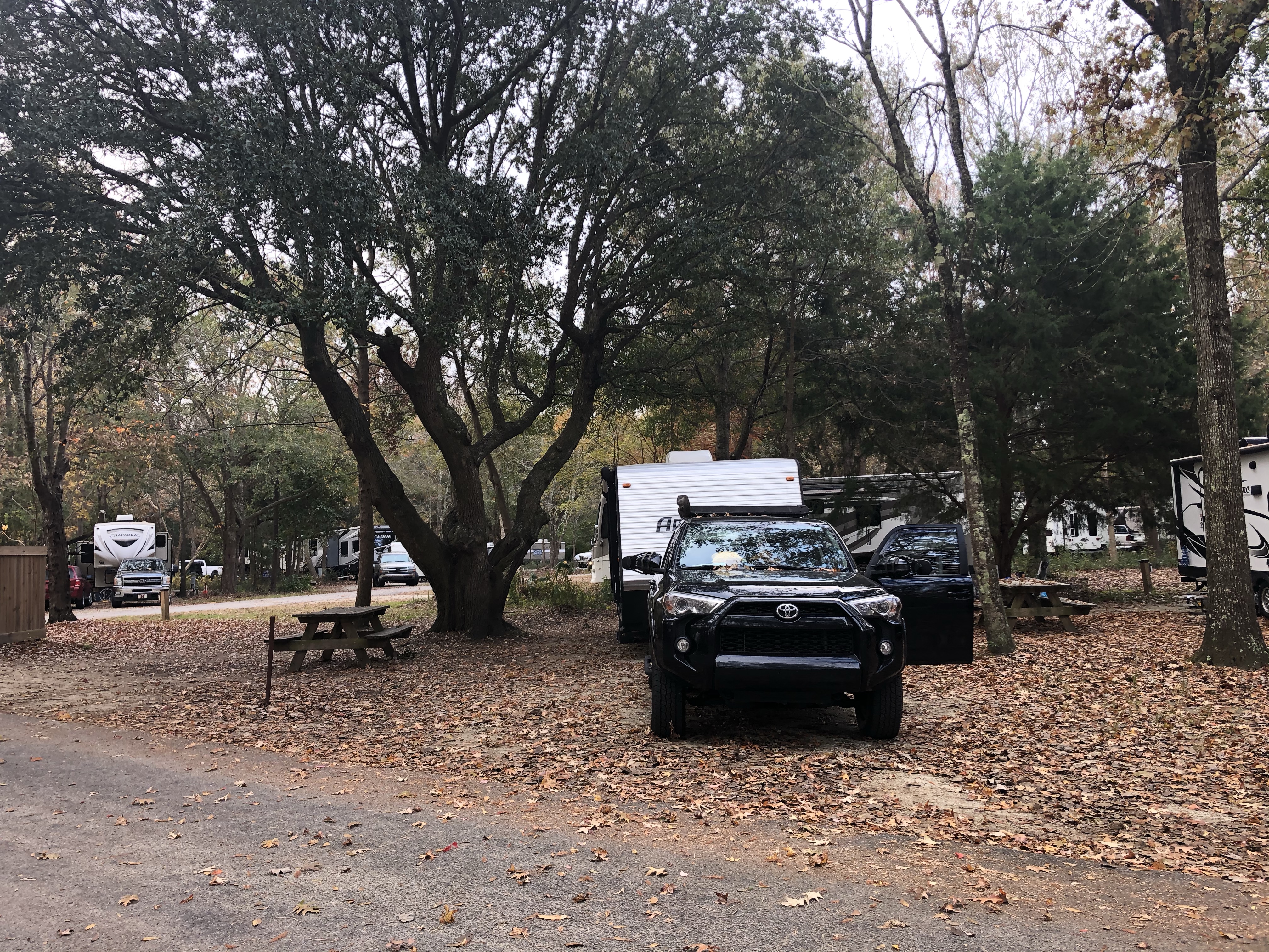 When we arrived I was pleasantly surprised. I’d had an image in my head of a Myrtle Beach style RV resort with cramped sites and no privacy, but the sites were actually well-spaced and there was a good amount of tree cover to provide a bit of buffer from the neighbors. We were on site 109 – since it was the only one available – and where a little concerned what we’d find when we arrived since the website had a note that said “a tree on site may prohibit awning use.” However, the site was perfect for our camper. We were able to back the camper to the edge of a beautiful oak tree and still have room to put out our awning and park the 4Runner: one of the benefits of a smaller camper and tow vehicle. It also was a large corner lot diagonal from the bathhouse, which worked great for us since my Dad tagged along and camped on our site in his tent. There was a trash dumpster at the edge of the site, but it didn’t cause any issues and seemed to be emptied regularly.