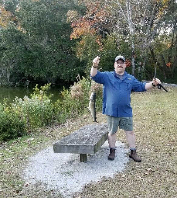 On Saturday we spent the morning enjoying the park’s playgrounds and hiking trails, then we took a side trip to somewhere I’ve wanted to visit for years: the Angel Oak. It was a quick jump over to John’s Island, probably about 15 minutes from the campground. The tree is tucked behind a chain link fence along a dirt road, and traffic can be a bit tight getting in and out, but it’s worth it to see a true spectacle of nature. After we got back, the boys and I took a nap and Steven and my Dad went and tried their luck at a fishing hole. Steven was excited to reel in a good size catfish! Later that evening Everett took Steven on a guided tour of the lights, then before we knew it, it was time to start packing up.