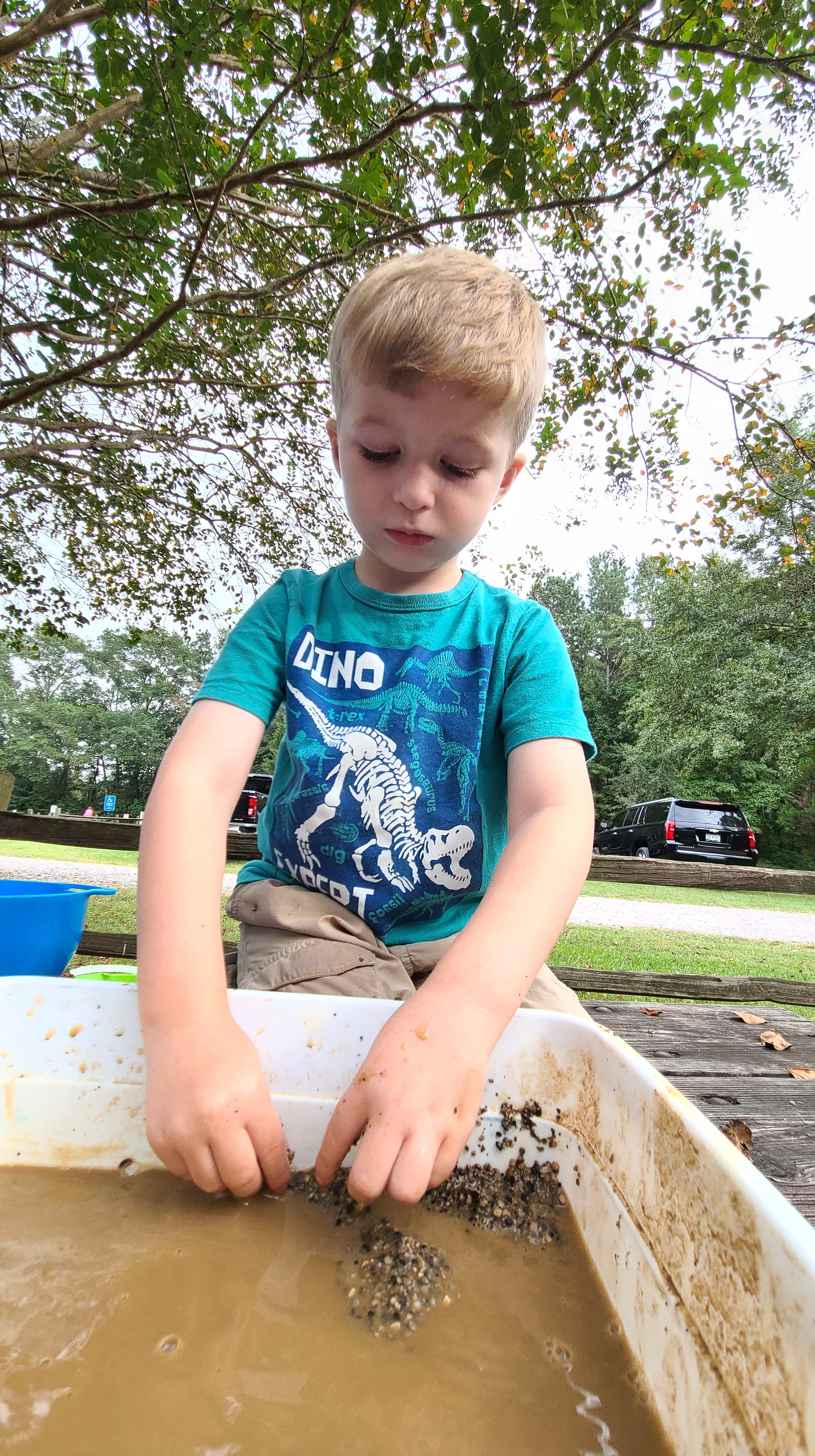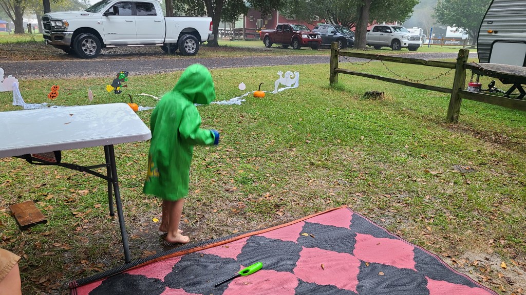 When we weren’t enjoying the Halloween festivities, the boys enjoyed mining for fossils and gems, jumping on the jump pillow, and playing on the playground. Everett even ran into some friends from his preschool on the playground. The adults enjoyed fishing, sitting by the campfire, and the company of friends. We did get a little bit of rain on Saturday, but nothing severe, and the boys loved the opportunity to jump in some puddles.